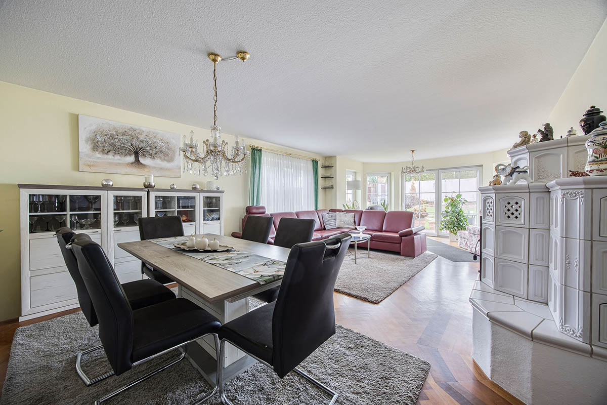 Essbereich, der durch einen hellen Wintergarten und den direkten Zugang zur sonnigen Süd-