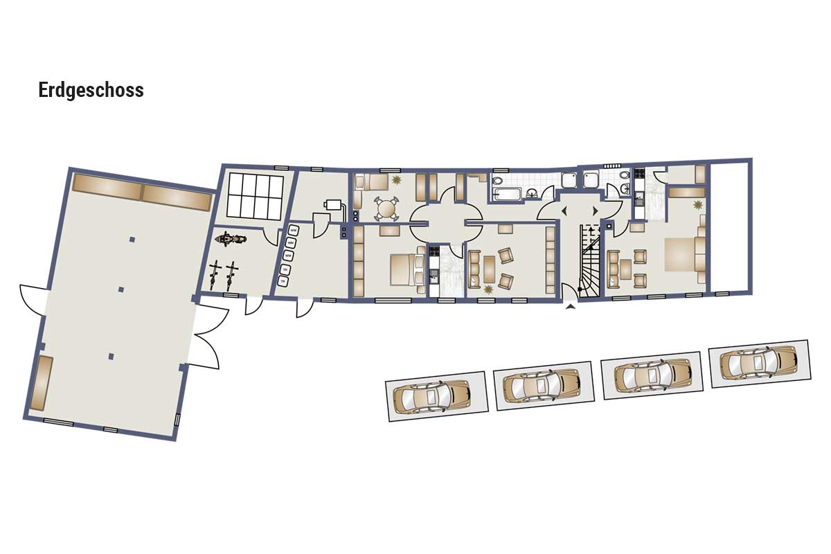 Nutzfläche sowie Stellplätzen. Im Erdgeschoss befinden sich zwei Wohneinheiten, weitere zwei