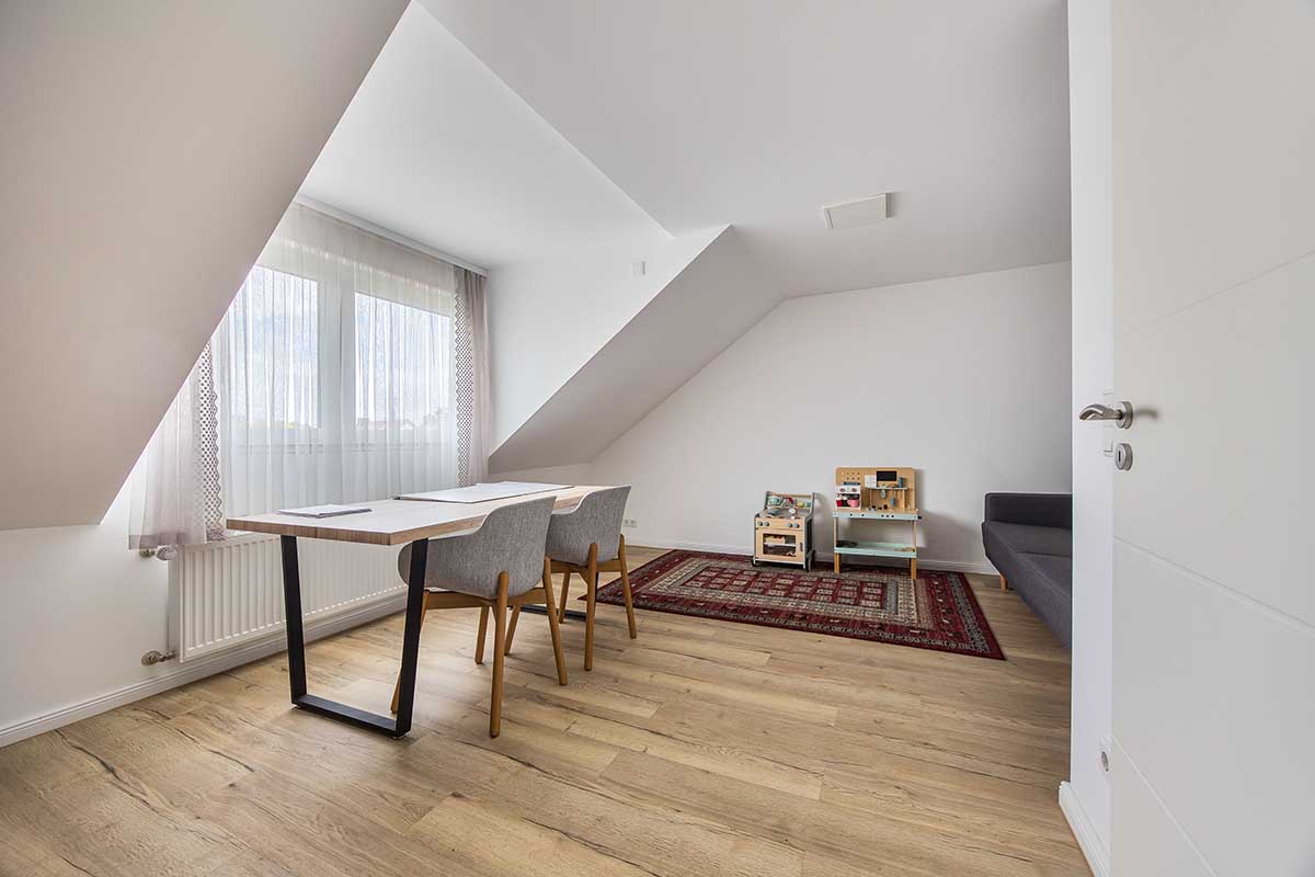 Das voll ausgebaute Dachgeschoss punktet mit viel Tageslicht und einem weitläufigen