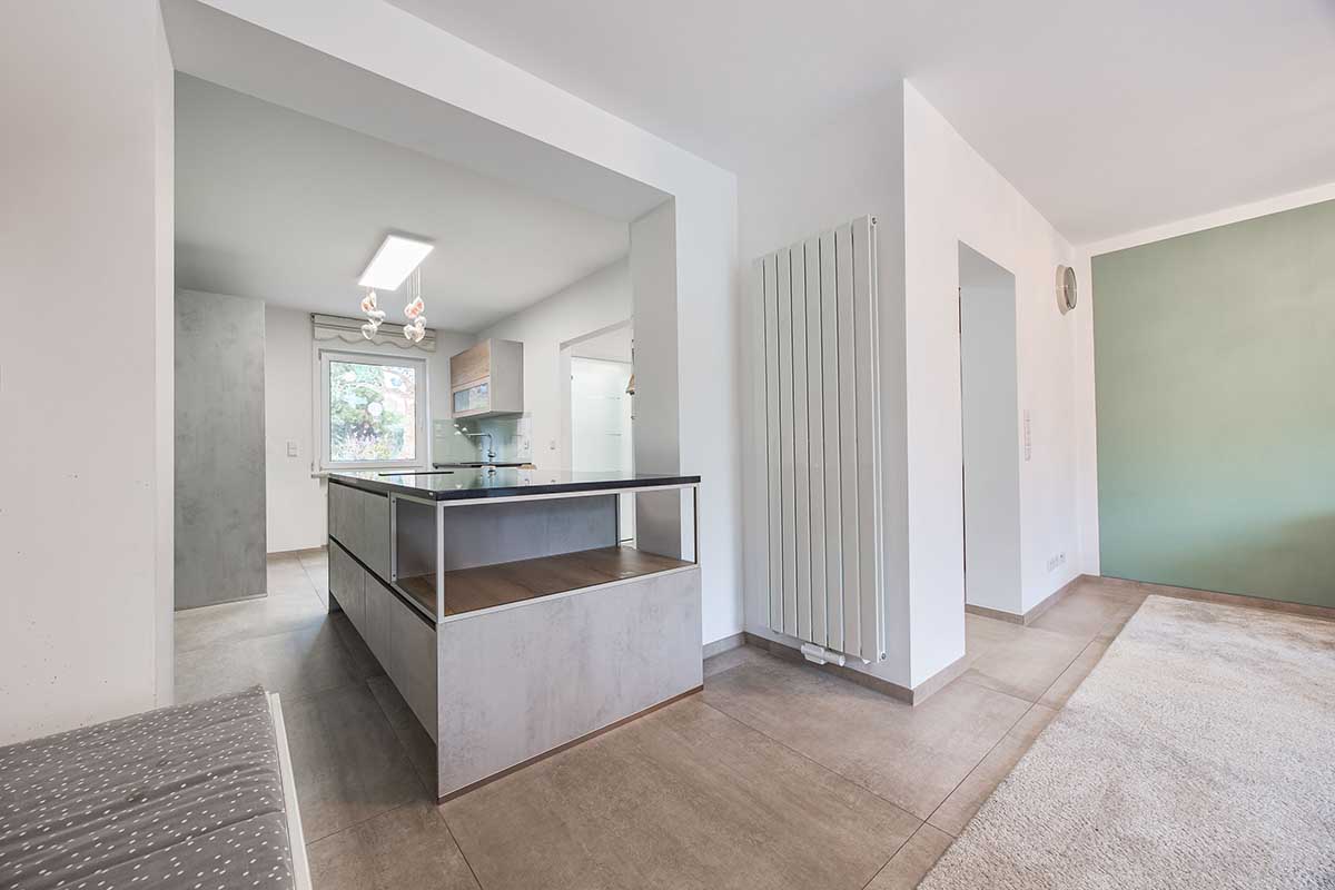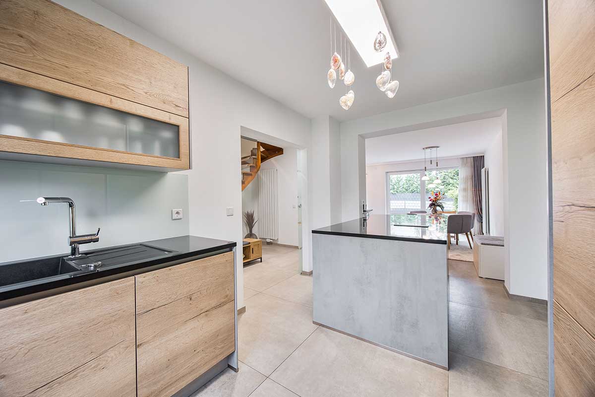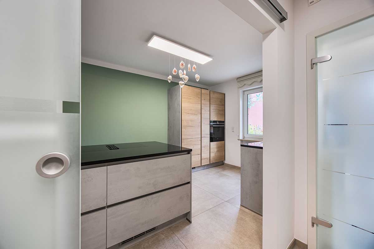 und klarer Linienführung, Fronten in Holz und Beton-Optik sowie edlen Granitarbeitsplatten.