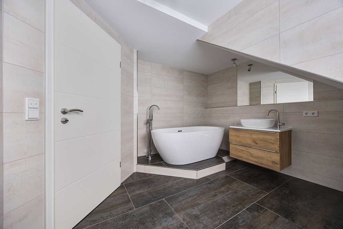 Ein elegantes Bad mit formschöner Badewanne rundet das Raumangebot auf dieser Ebene